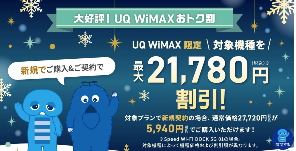 現在、UQ WiMAXでは 対象端末が最大21,780円割引 になる「おトク割キャンペーン」が実施されています。